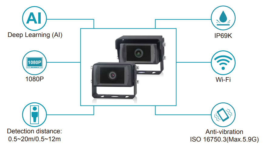 The cameras can be installed on the side, front and back of a vehicle to intelligently detect pedestrians and vehicles within 20M – in real time.